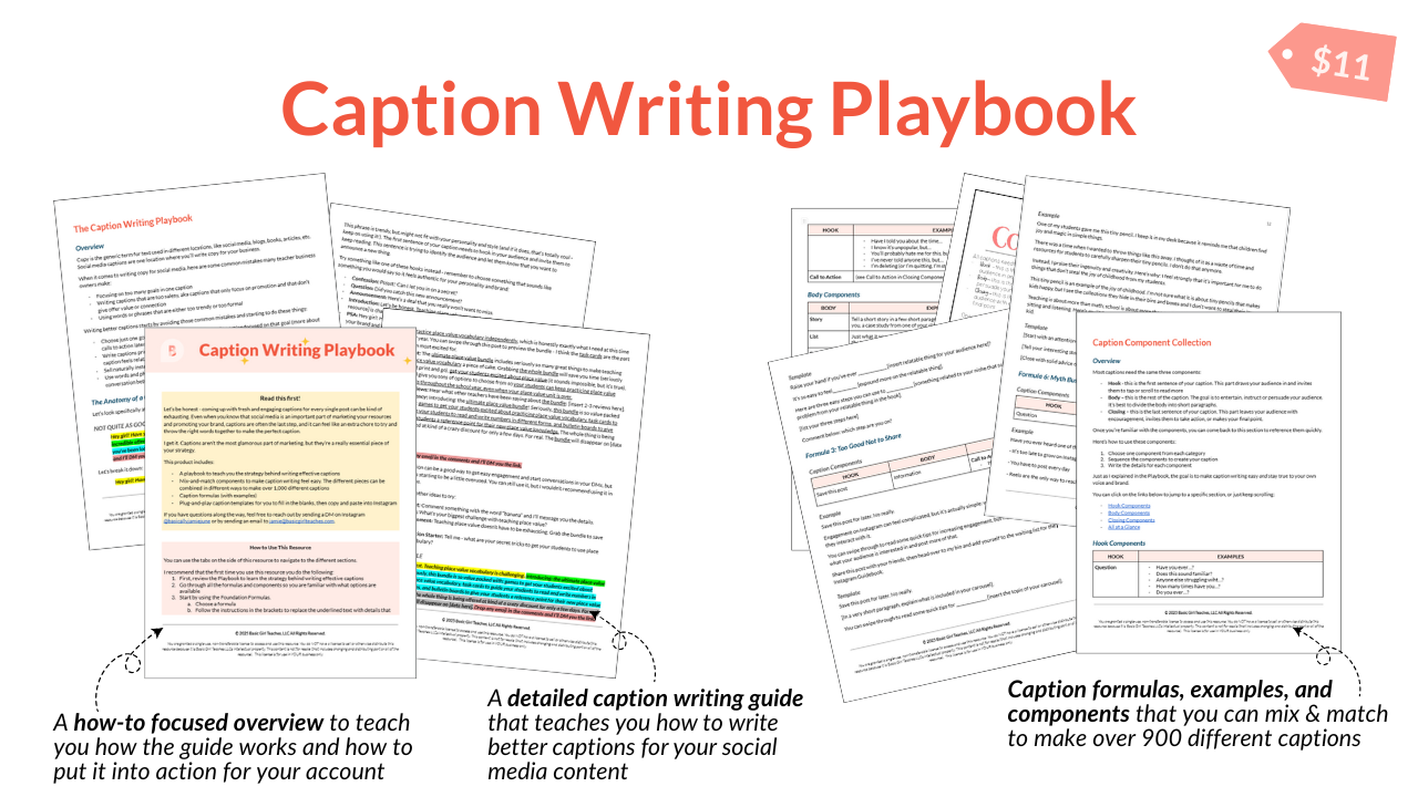 You can use these components, examples, formulas, and templates to create captions over and over again without getting stuck wondering how to start your captions or what to talk about.